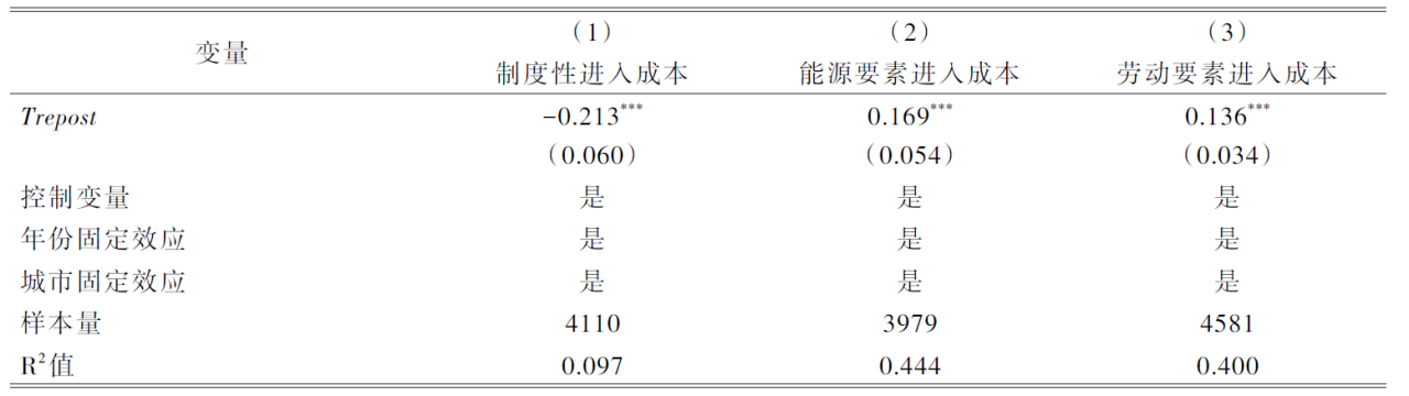 表2 机制检验:低碳城市试点政策对进入成本机制的检验结果