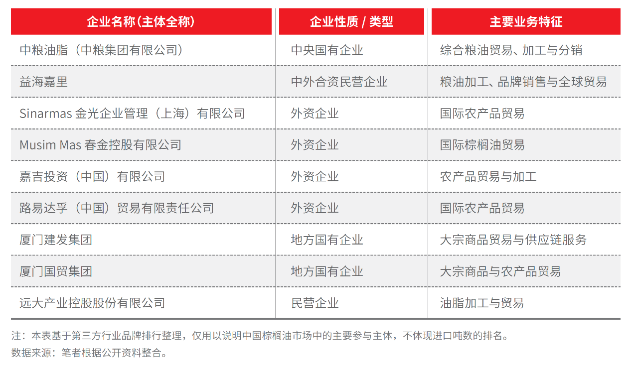 从市场结构看,中国棕榈油进口和贸易长期由少数大型粮油贸易商和综合油脂加工企业主导,主体类型涵盖中央和地方国有粮油集团、跨国粮商在华机构以及本土大型油脂加工与贸易企业。这类企业在进口、加工和贸易网络中具有显著的市场影响力,在保障国内粮油供应安全和贸易稳定方面发挥关键作用,同时也直接暴露于国际绿色贸易规则和可持续标准不断强化所带来的合规压力之下(见表1)。