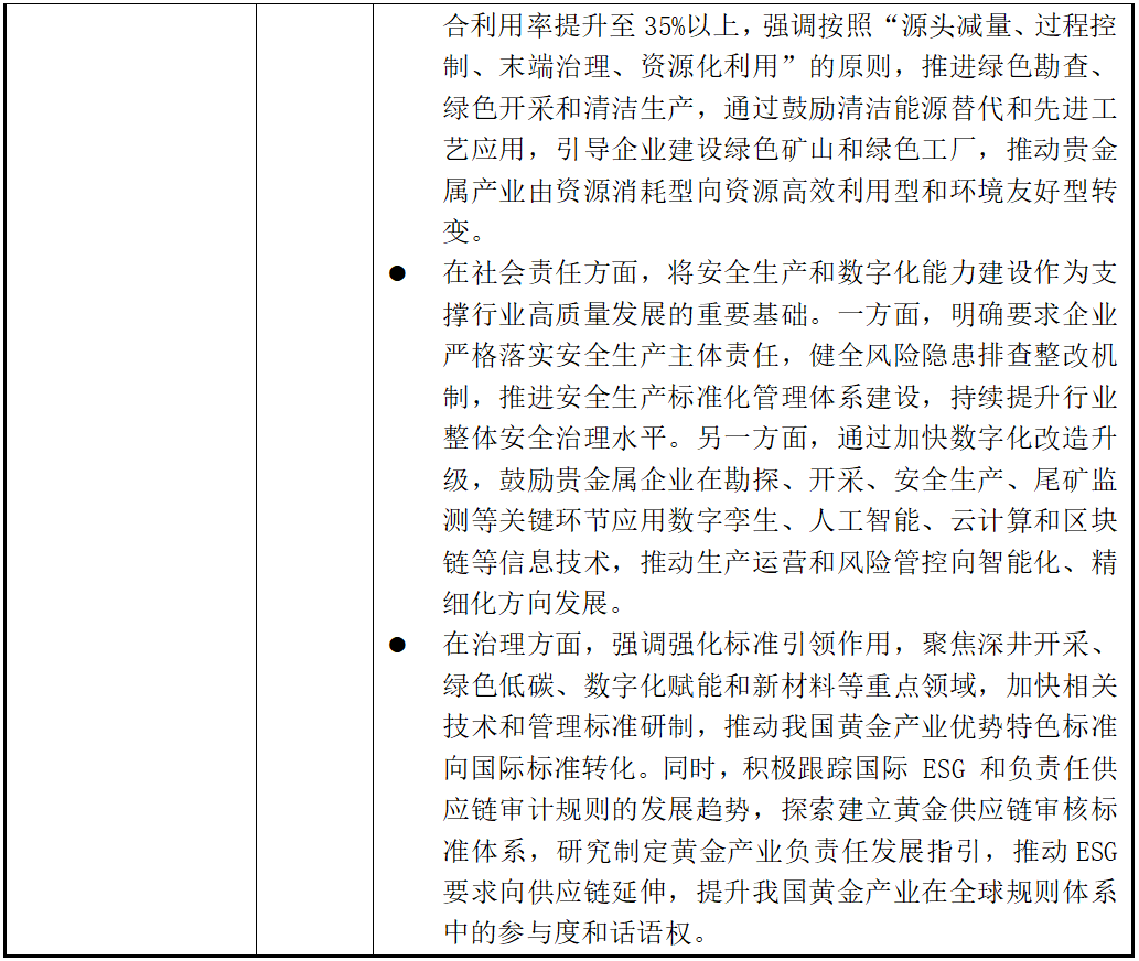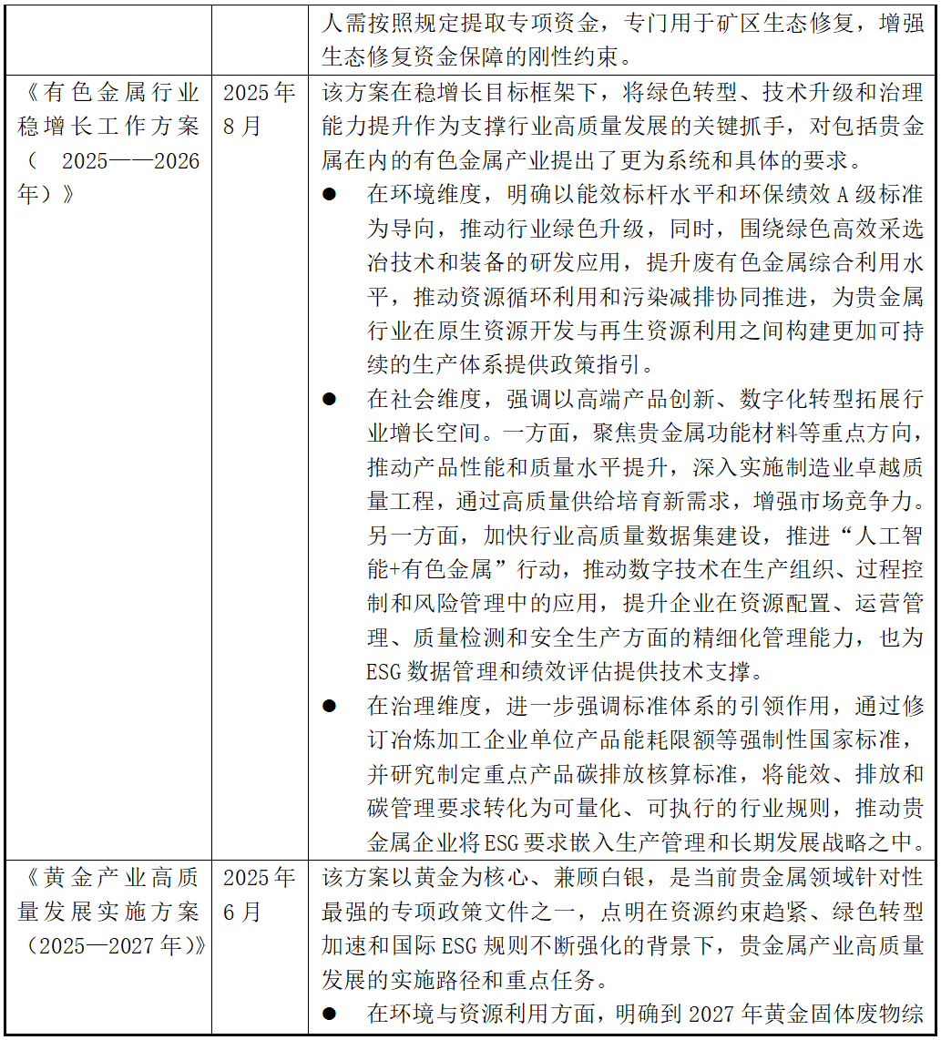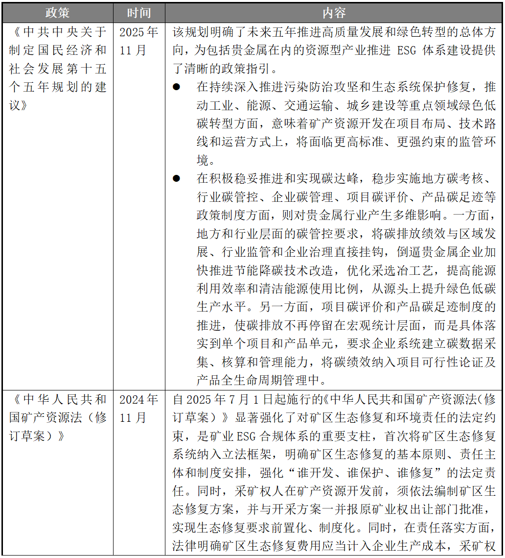 在此背景下,贵金属行业的发展逻辑正在发生实质性变化。环境保护、资源利用效率、安全生产与技术创新等ESG要素,已不仅只是项目审批或合规检查要求,而是被纳入产业政策与行业发展的核心框架,直接影响矿产资源的配置决策、项目审批与准入条件,以及企业在长期发展中实现可持续竞争力提升。通过战略层面的中长期发展规划明确转型方向和约束目标,基础性法律制度强化生态修复责任和开发全过程的监管要求,以及行业专项政策对技术路径、效率提升和安全治理提出具体要求,我国正在逐步形成覆盖矿产资源勘查、开发、利用与修复全生命周期的制度体系,将环境与资源约束转化为推动行业结构优化和提升企业竞争力的制度力量,为贵金属行业的高质量、可持续发展提供可预期的政策支撑。