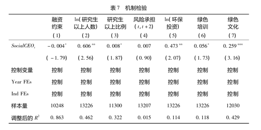 在企业内开展环保活动,组织环保教育培训有助于塑造企业绿色文化与学习氛围,提高员工的绿色知识储备。为此,本节使用国泰安环境数据库中是否开展环保教育与培训指标作为企业内部绿色活动的代理变量。如表7列(6)所示,自变量SocialCEOt为正,且在10%的水平上显著,即社会价值导向型CEO通过增加企业绿色培训提高企业绿色创新水平。其次,我们还采用“内容分析法”,通过查找样本企业公司官网上有关企业文化体系等陈述语句,是否有关于环境保护的表述,如有“绿色发展”“和谐”“可持续”“低碳”“节约”“减排”等字样,则赋值为1,否则,赋值为0。回归结果如表7列(7)所示,自变量SocialCEOt为正,且在1%的水平上显著,即社会价值导向型CEO通过培养企业绿色文化提高企业绿色创新水平。