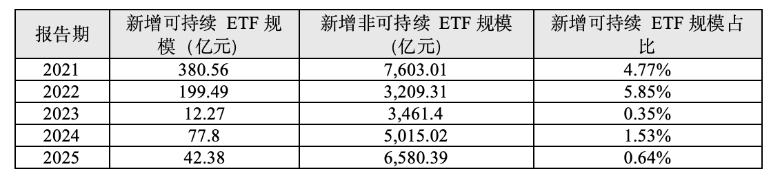 从规模变化看,可持续主题ETF产品资产规模在2020年后进入快速增长。2021年可持续主题ETF产品新增规模达到380.56亿元,占当年ETF新增规模的4.77%,为样本期内的阶段性高点,说明在可持续投资理念快速升温背景下,相关产品一度获得较为集中的资金配置。此后,可持续主题ETF产品新增规模出现明显回落。2022年新增规模降至199.49亿元,占比上升至5.85%,但绝对规模较前一年明显下降;2023年新增规模进一步收缩至12.27亿元,占比仅为0.35%。2024年至2025年,新增可持续主题ETF产品规模42.38亿元,虽有所回升,但整体仍处于较低水平。这一结构特征表明,可持续主题ETF仍处于过渡阶段,未来在投资者认知深化、指数体系完善以及可持续明确主题驱动下,相关产品规模仍具备进一步提升空间。
