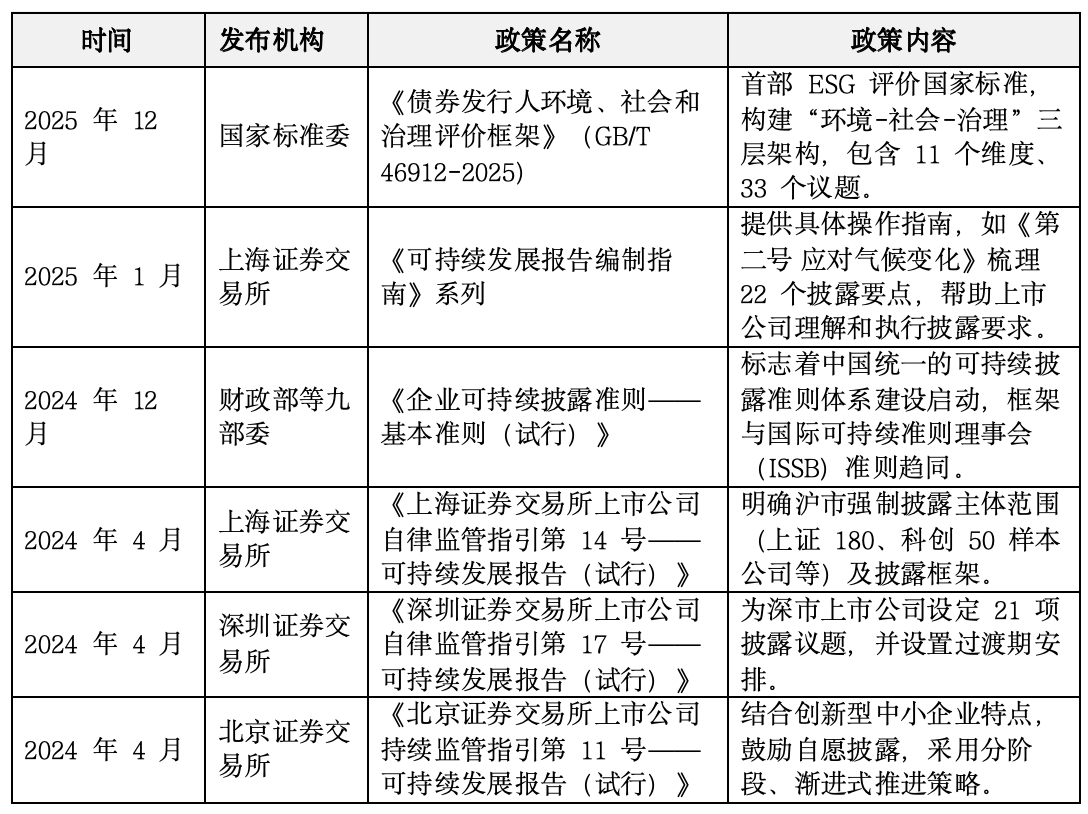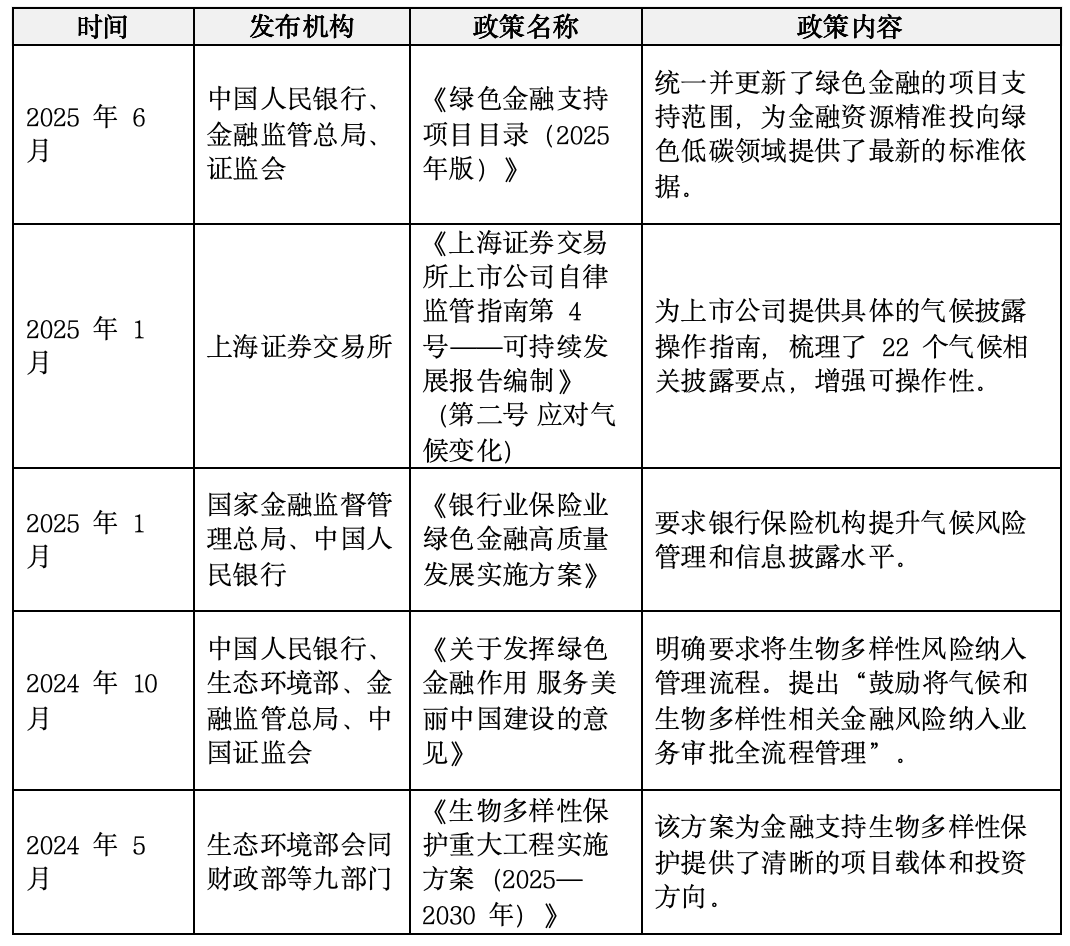 绿色转型制度日益完善,可持续议题持续深化。当前,中国可持续金融政策正从构建基础信息披露框架,向深化专项议题风险管理方向迈进。表3列示部分专项意见、实施方案与目录标准,体现出政策焦点正倾向于将“气候风险”和“生物多样性保护”等实质性议题,系统性融入金融机构与企业的核心决策流程。监管机构陆续发布专项意见、更新目录标准,明确要求金融机构识别、评估并管理其投融资活动可持续风险与机遇,推动可持续投资进入精细化、专业化管理的新阶段。
