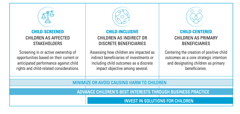 实务操作层面,CLIF通过“儿童筛查型”、“儿童包容型”与“儿童中心导向(Child-Centered)”三大核心支柱(如下图),支持面向儿童的解决方案,构建避免或最小化对儿童造成伤害的可持续投资框架,推动资本配置转向主动的儿童福祉创造与价值赋能。其中,“儿童筛查型投资”保障“避免伤害”的基本底线,“儿童包容型”将儿童发展纳入商业影响目标,“儿童中心导向”则直接投向服务儿童的解决方案,助力投资者精准挖掘长期价值。