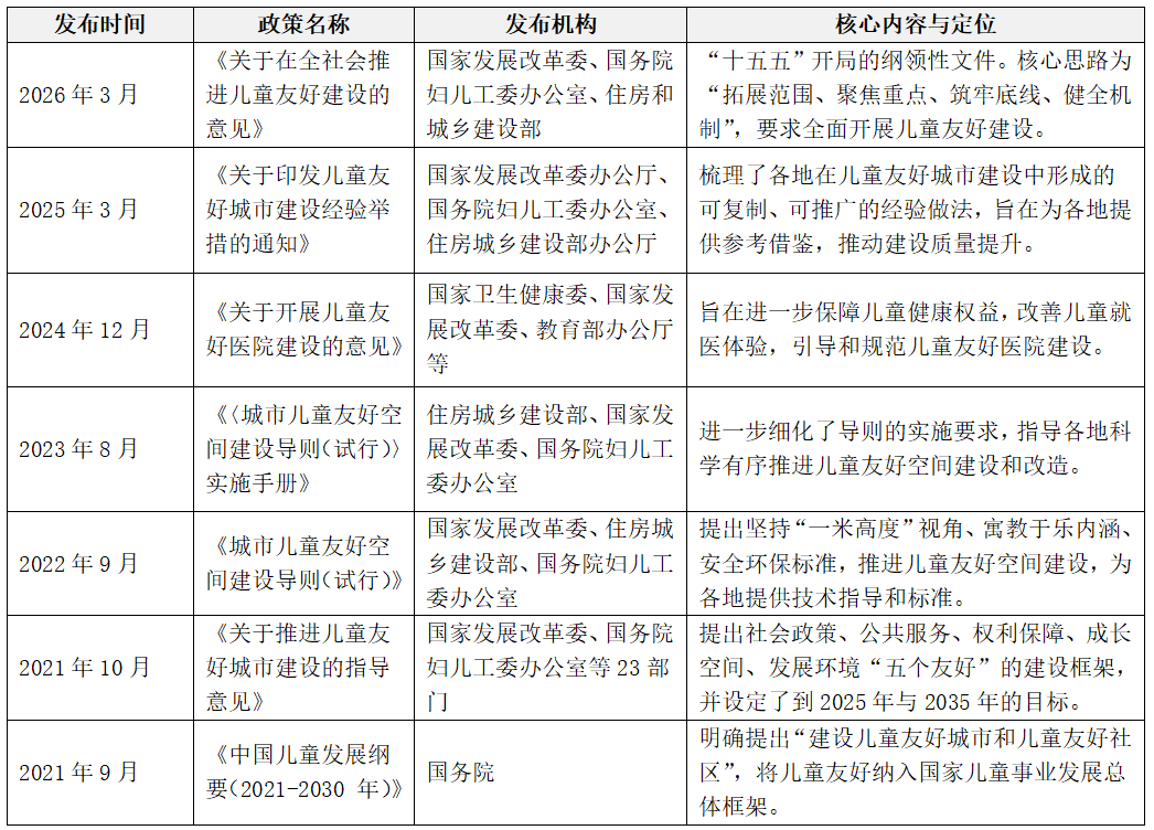 制度层面,《关于推进儿童友好城市建设的指导意见》与《中国儿童发展纲要(2021—2030年)》的顶层设计为儿童权益保障奠定基础,持续推动儿童友好理念融入城市发展规划与普惠金融相关评价体系。前者通过中央预算内投资引导与专项债券支持,为城市基础设施的适儿化改造提供了制度化的资金路径;后者则通过强化“儿童优先”原则,将公共服务供给与城市物理空间建设深度绑定。表1梳理了2021年至2026年国家层面出台的儿童友好建设系列政策,包含顶层纲领、总体指导以及更为细化的专项规范,现阶段儿童友好城市建设正经历从试点探索到全社会机制建设的实质性进程。