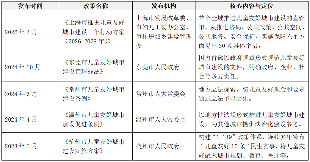 地方层面,各地监管部门积极响应顶层制度规范,在儿童友好城市建设领域开展法治化与制度化探索。如下表所示,多地(上海、杭州、常州、温州、东莞等地)发布相关政策或开展实践举措,以地方性法规、政府规章、行动方案等形式因地制宜地推进儿童友好城市建设,集中体现出在儿童权益保障领域,国家顶层设计向地方落地转化的多样化路径。