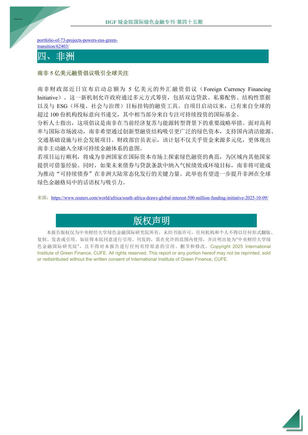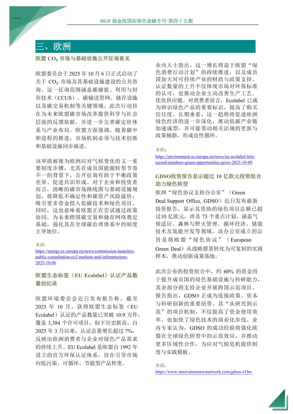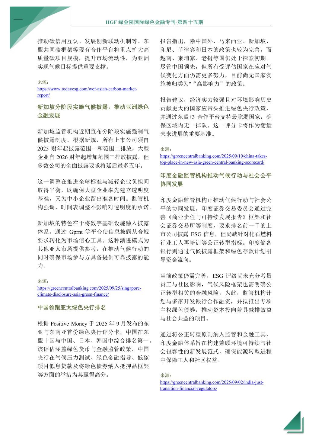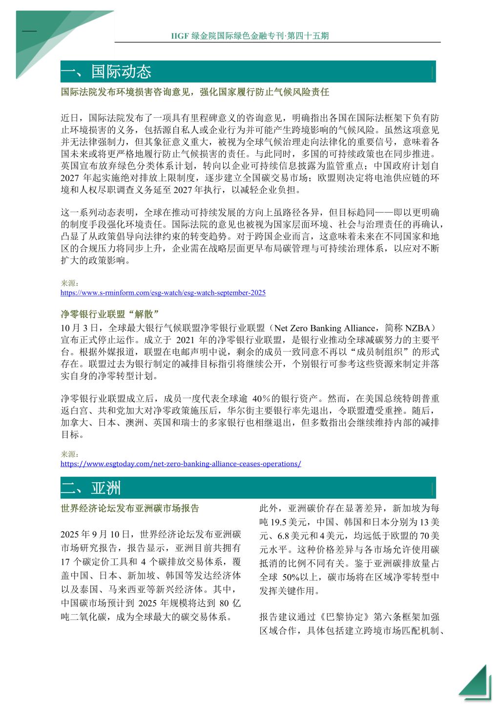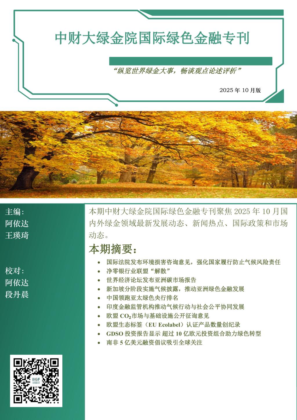本期国际绿色金融专刊将为您介绍2025年10月全球绿色金融领域的最新发展和动态。国际法院发布环境损害咨询意见以强化国家履行防止气候风险责任,净零银行业联盟“解散”。在亚洲,世界经济论坛发布亚洲碳市场报告,新加坡分阶段实施强制气候披露,中国领跑亚太绿色央行排名,印度金融监管机构推动气候行动与社会公平协同发展;在欧洲,欧盟CO₂市场与基础设施公开征询意见,欧盟生态标签认证产品数量创纪录,欧洲“绿色协议支持办公室“(GDSO)投资报告显示,其资助绿色项目已经超过10亿欧元;在非洲,南非启动5亿美元融资倡议推进转型。