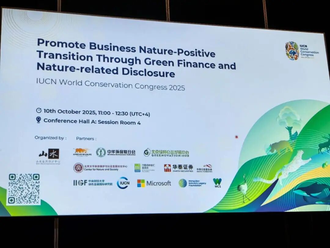 2025年10月10日上午,山水自然保护中心主办,中央财经大学绿色金融国际研究院等多家机构支持的“通过绿色金融与自然相关信息披露促进企业‘自然向好’转型(Promote Business Nature-Positive Transition Through Green Finance and Nature-related Disclosure)”主题研讨会在阿布扎比举办。该会议是2025年阿布扎比世界自然保护大会(WCC)的边会之一。会议聚焦绿色金融、生物多样性保护与企业可持续转型,吸引了来自国际组织、金融机构及科研机构的多方专家参与。