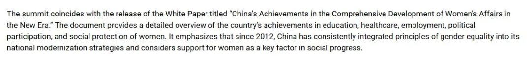 土库曼斯坦综合门户网站Orient.tm的文章关注到,全球妇女峰会恰逢《新时代中国推进妇女全面发展的实践与成就》白皮书发布。这份白皮书详细阐述了中国妇女在教育、医疗卫生、就业、参政议政和社会保障等方面取得的成就,并强调,1995年在北京举行的第四次世界妇女大会上通过的两份文件,已成为促进妇女权利、实现性别平等的重要国际文件。